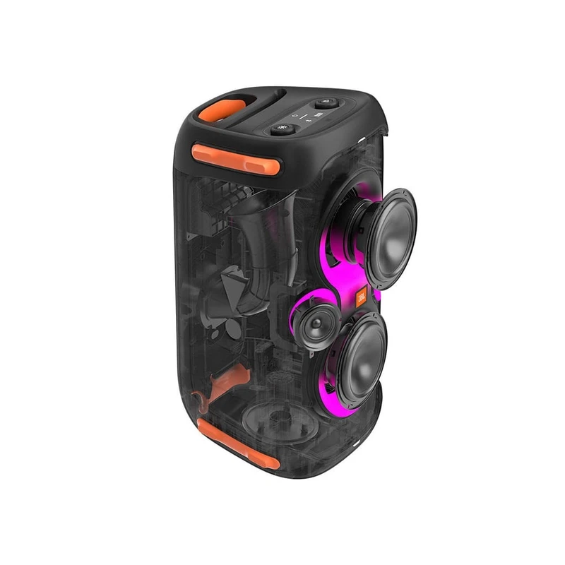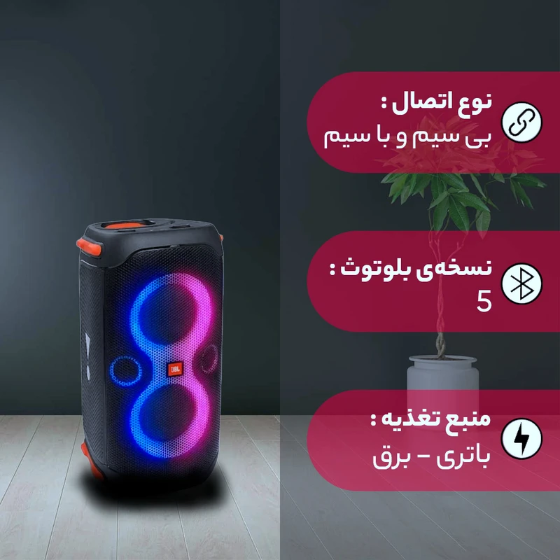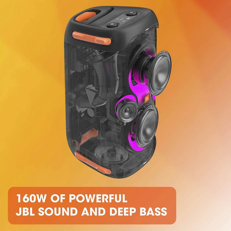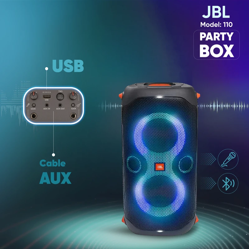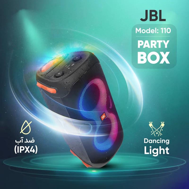 اسپیکر بلوتوثی قابل حمل جی بی ال مدل PARTYBOX 110؛ با اسپیکر قدرتمند و قابل حمل JBL PartyBox 110، میتوانید مهمانی خود را با صدای شگفتانگیز و نورپردازی جذاب آغاز کنید. این دستگاه با نورپردازی LED منحصر به فرد و صدای قوی با بیس عمیق، تجربهای تازه به هر جشن و مهمانی میبخشد. طراحی جمع و جور اسپیکر بلوتوثی قابل حمل جی بی ال مدل PARTYBOX 110 به شما این امکان را میدهد که آن را به راحتی با یک دست حمل کنید. این اسپیکر با صدای با کیفیت JBL Original Pro و قدرت 160 وات، پاسخ فرکانسی از 45 هرتز تا 20 کیلوهرتز و حساسیت 6 دسی بل را ارائه میدهد و شامل فناوریهای پیشرفتهای مانند بلوتوث 5.1 است.