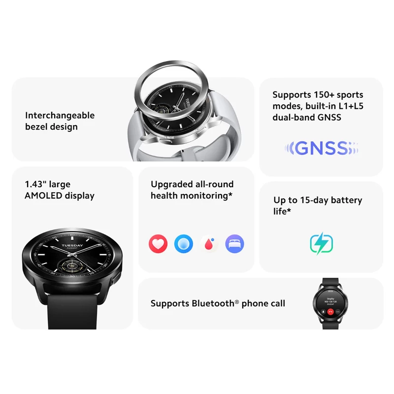 شارژدهی تا ۱۵ روز / استاندارد مقاومت در برابر نفوذ آب ۵ATM / قابلیتهای مکانیابی BeiDou, GPS, GLONASS, Galileo, QZSS / بلوتوث ۵.۲