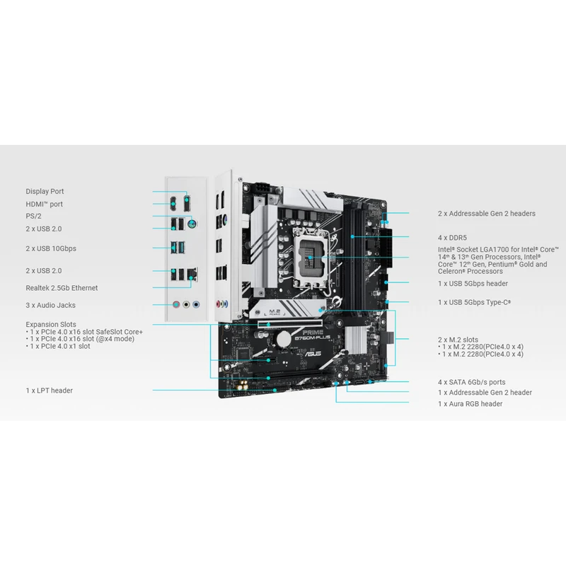 مادربرد ایسوس مدل PRIME B760M PLUS یک انتخاب قوی برای کاربرانی است که به دنبال ترکیبی از عملکرد بالا و پایداری در سیستمهای مبتنی بر پردازندههای اینتل هستند. این مادربرد از سوکت LGA 1700 پشتیبانی کرده و با پردازندههای نسل ۱۳ و ۱۴ اینتل سازگار است.