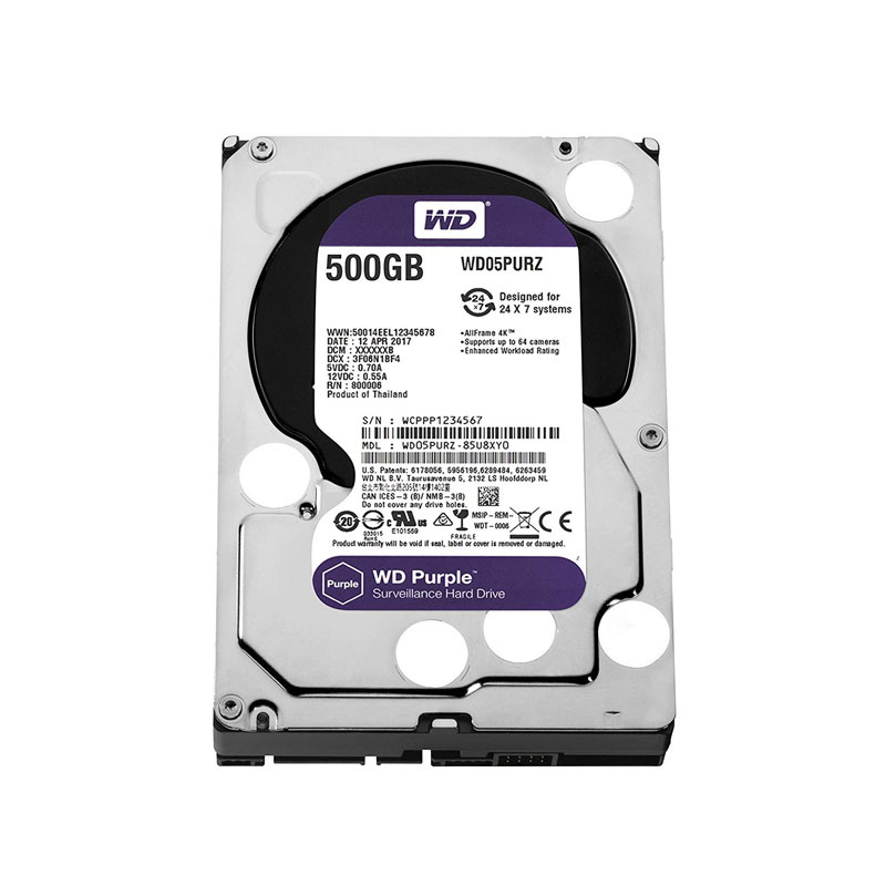 هارد دیسک اینترنال وسترن دیجیتال مدل Purple WD05PURX ظرفیت 500 گیگابایت : هارد WD50PURX یکی از محصولات شرکت Western Digital است که به‌طور ویژه برای استفاده در سیستم‌های نظارت تصویری طراحی شده است. این هارد دارای ظرفیت ۵۰۰ گیگابایت و سرعت چرخش 5400 دور در دقیقه است.