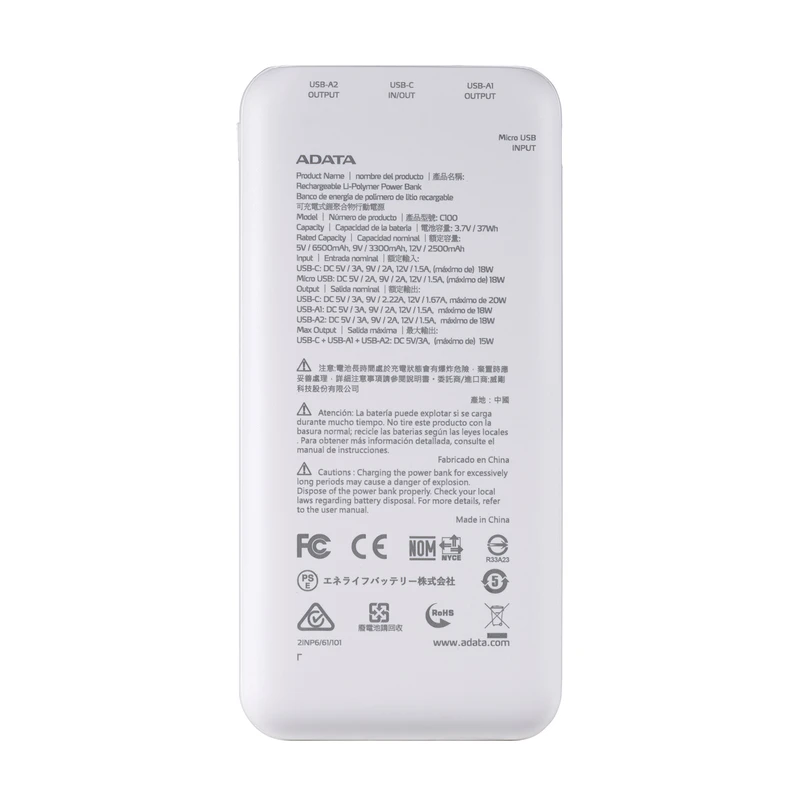 پاوربانک ای دیتا مدل C100 ظرفیت 10000 میلی آمپر ساعت؛ شارژر همراه «ای دیتا» مدل «C100» یک محصول باریک، سبک و خوشدست است که با روکش مقاوم به بازار عرضه شده است. این پاوربانک دارای دو درگاه خروجی USB و یک ورودی تیپ C است و بدنه آن در برابر آتش مقاوم میباشد. با استفاده از این مدل، میتوانید گوشی موبایل خود را سریعتر شارژ کنید و همچنین خود پاوربانک را نیز به سرعت شارژ نمایید.