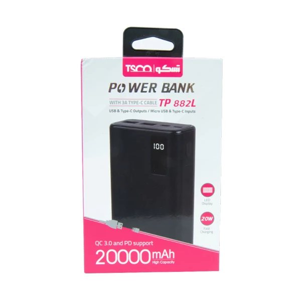 پاوربانک تسکو مدل TP 882L ظرفیت 20000 میلی آمپر ساعت با وزن تقریبی 980 گرم و در رنگ مشکی جذاب و کلاسیک طراحی شده است.