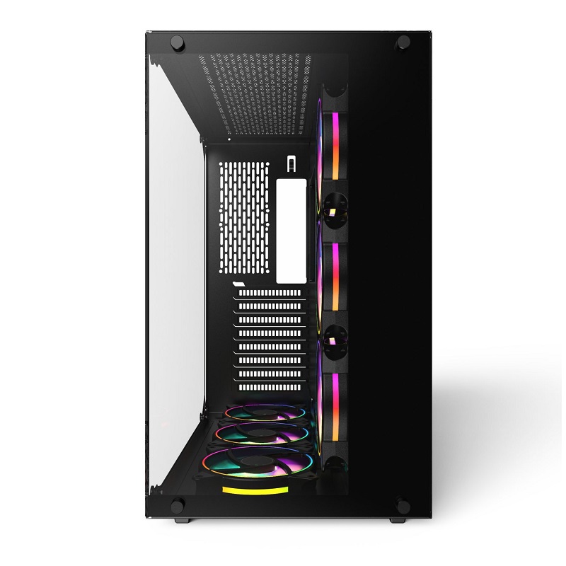 همچنین تعداد 8 عدد شکاف توسعه که از طریق پیچ های به کار رفته می توان تعداد آنها را مدیریت کرد به خوبی طراحی شده است. لازم به ذکر است امکان نصب کارت گرافیک به صورت عمودی هم با این طراحی فراهم شده تا بتوانید به زیبایی و عملکرد هرچه بیشتر سیستم خود بیافزاید. در قسمت بالای کیس کلیدهای روشن/خاموش، کلید reset یک درگاه USB ورژن 0.2 به همراه دو درگاه USB ورژن 0.3 و یک درگاه 0,2. ver 1.3 USB C-Type در کنار ورودی و خروجی صدا از نوع AUDIO HD باعث شده تا دسترسی به پنل راحت تر بوده و تمامی نیازهای شما را پاسخگو است.